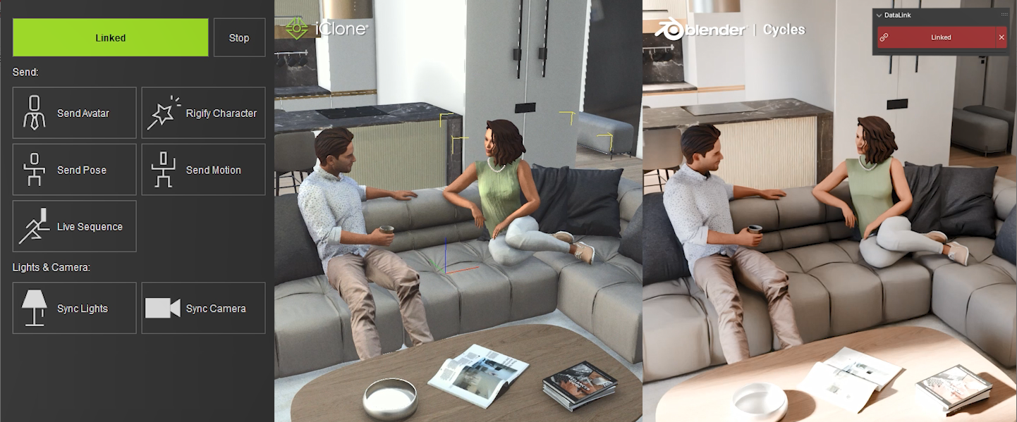 新的数据链接功能简化了通过单击在CC、iClone和Blender之间同步角色、姿势、变形、运动和实时序列的过程。这消除了导出和导入FBX文件的需要,使工作流程更加高效。它还允许照明和相机设置从CC和IClone同步到Blender,确保跨平台的视觉一致性。