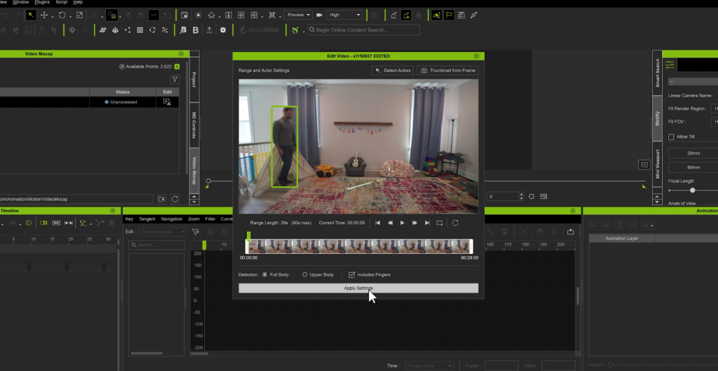 工作流程再简单不过:将视频拖入视频动作捕捉窗口,选择表演者和追踪模式,点击应用并生成。iClone将返回: