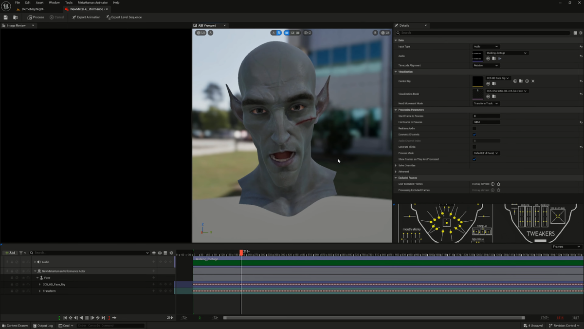 我录制了自己的表演,并将音频导出为WAV文件,作为UE5中MetaHuman动作捕捉的输入素材。生成动画后,我禁用了头部运动(以便复用动作捕捉动画),并将面部表演与身体动作进行整合。后续遇到眼球运动追踪异常的问题,通过在控制骨架中启用“控制注视”选项,并逐帧手动调整眼球位置来增强真实感,最终解决了该问题。