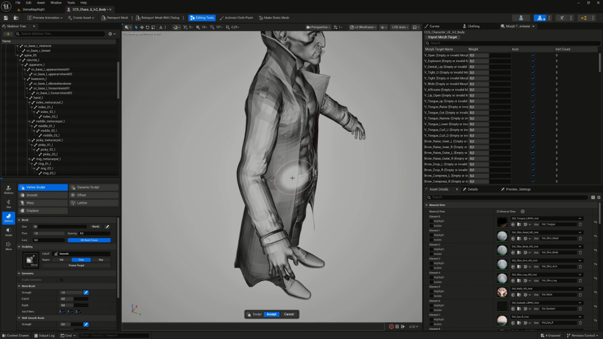 在虚幻引擎5中,我注意到大衣网格与身体发生穿透,尽管在虚幻引擎5中并未出现此问题。通过在骨骼网格编辑器中使用顶点雕刻工具,我直接在虚幻引擎内调整大衣几何体以解决该问题。同时利用动画曲线编辑功能循环行走动作并延长序列时长。