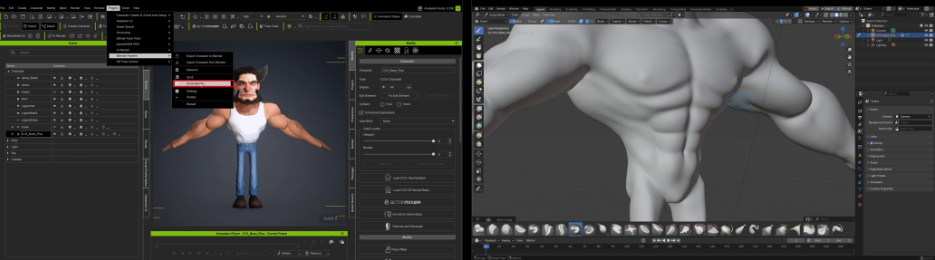 现在,为了进行最终细节处理,我将角色再次导回Blender。这次我使用Go Blender Morph功能,以细分级别2导出。这将生成高密度网格,其分辨率足以直接在模型上雕刻肌肉纹理等精细细节。