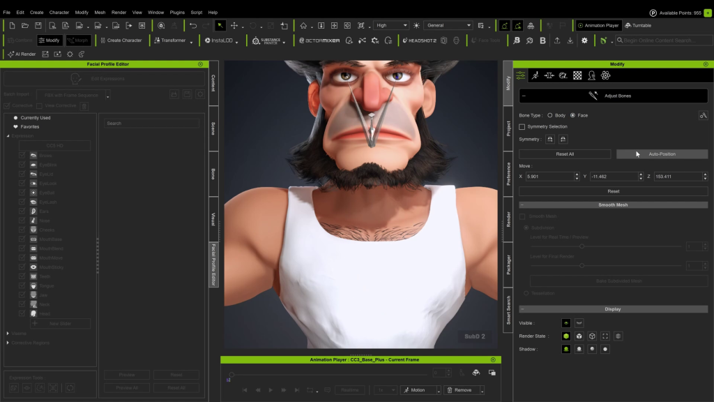 1.面部表情:我准备在面部轮廓编辑器中调整他的表情。对于夸张的角色,你可以使用网格编辑配合柔性选择工具进行调整。你也可以将表情滑块调至100以上,然后进行烘焙以获得更极端的效果。